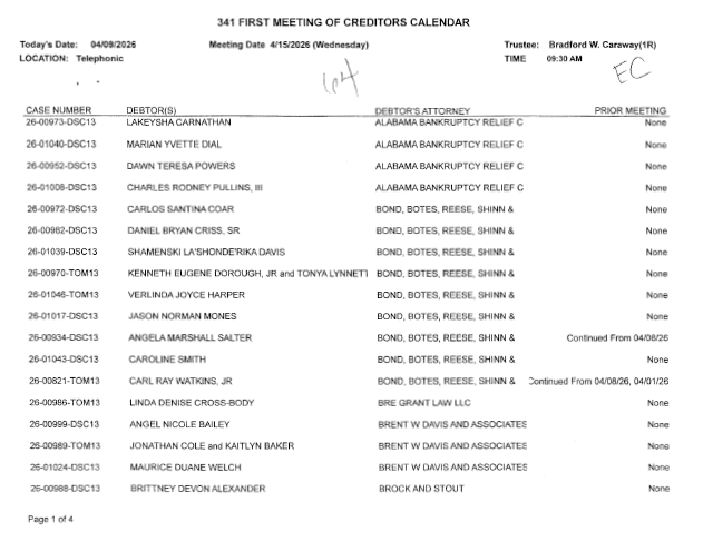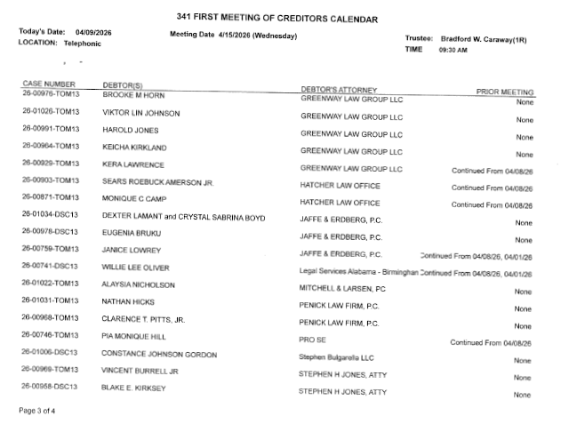 THESE PRECAUTIONS ARE BEING TAKEN DUE TO THE PUBLIC HEALTH CRISIS RELATED TO COVID-19 (CORONAVIRUS). §341 MEETINGS OF CREDITORS SHALL BE CONDUCTED TELEPHONICALLY UNTIL FURTHER NOTICE.