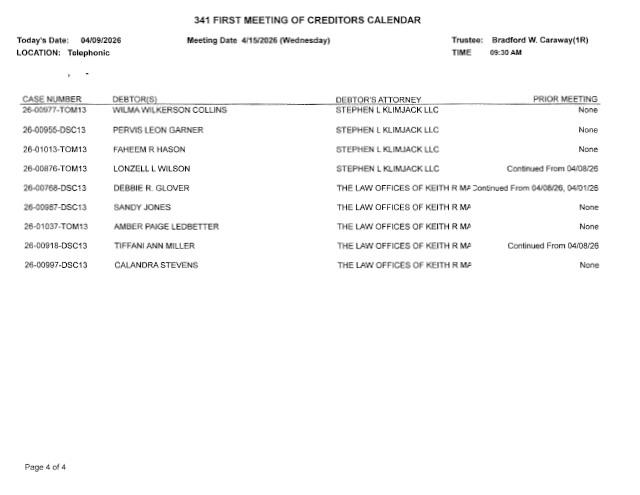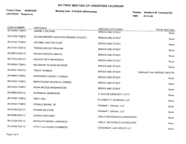 BEGINNING WITH THE MEETING OF CREDITORS SET FOR MARCH 25, 2020,